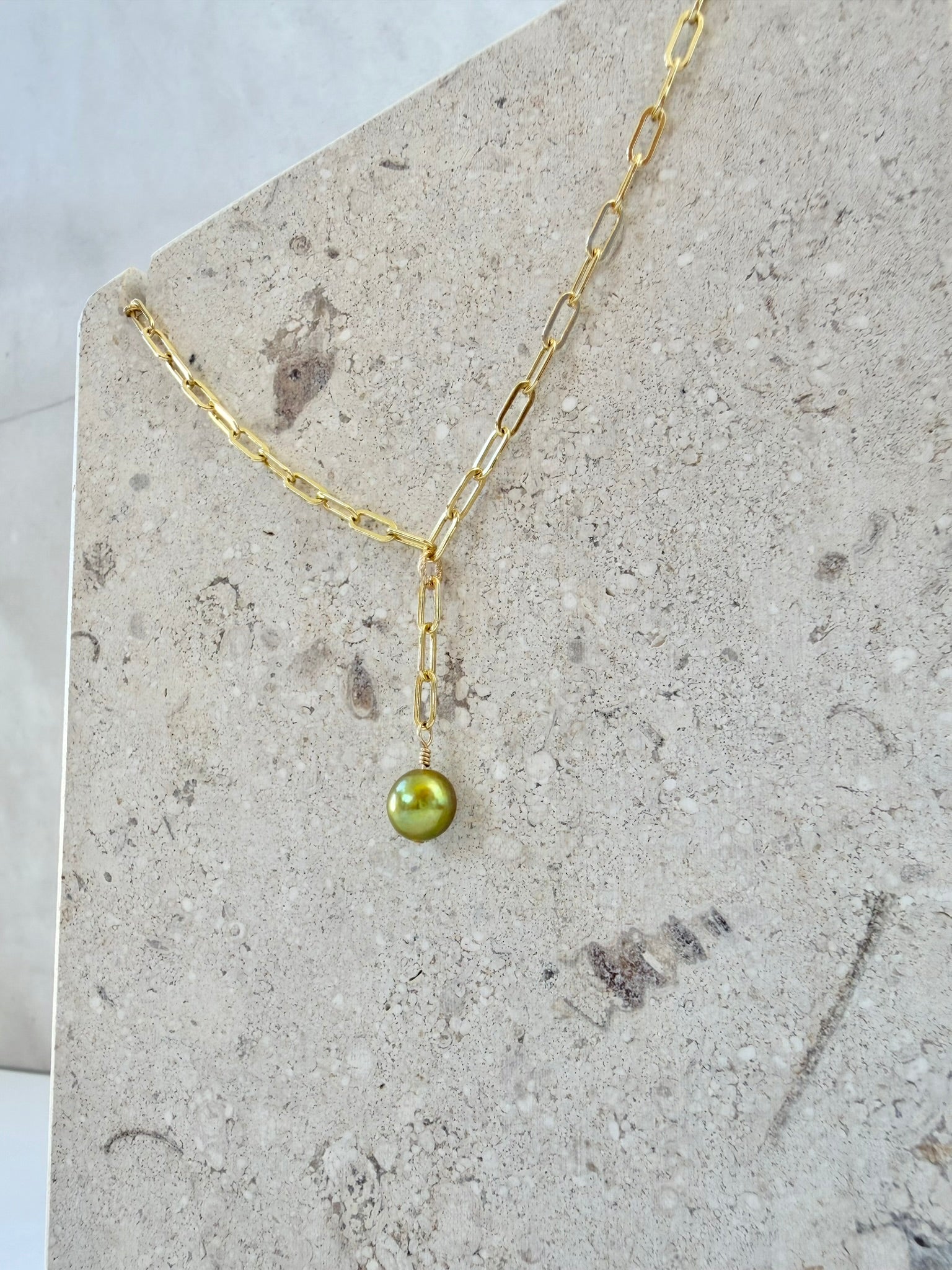 Our daintiest enhanced pistachio Tahitian pearl rests simply along a medium paperclip chain. The pistachio pearl is crafted for nature lovers and symbolizes the resilience and renewal of the soul.