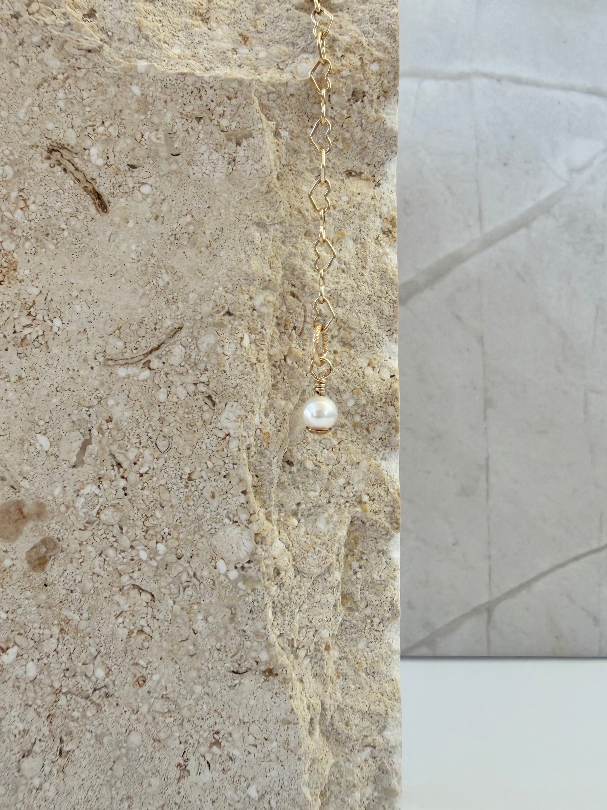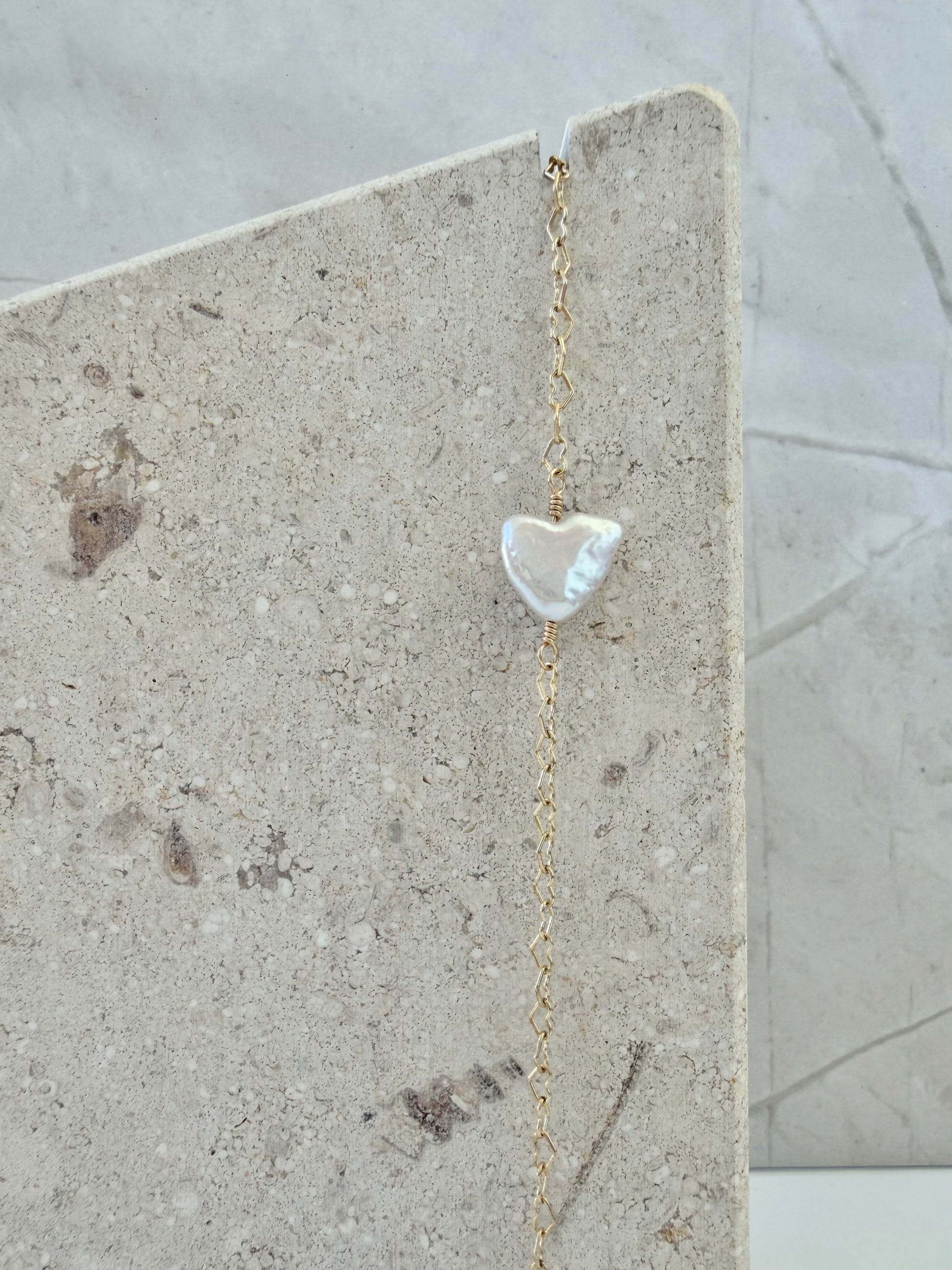 An iridescent white heart-shaped pearl & chain. This piece is a sweet and gentle reminder to continuously carry love & grace with you always, for yourself & others.