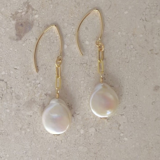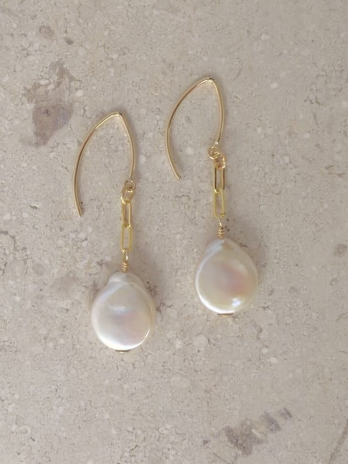 An iridescent XL white freshwater coin pearl pair of earrings. A flattened style of pearls, unique and unforgettable.