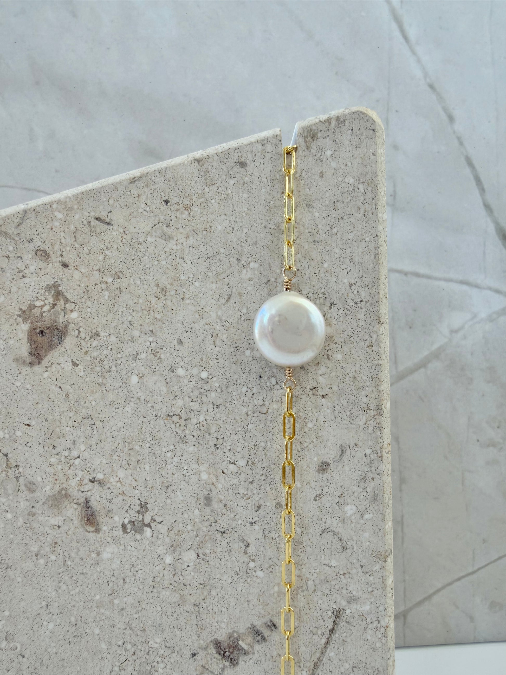 A dashing XL tinted white freshwater coin pearl alongside a medium paperclip chain is meant to be worn with confidence and joy. Beautifully worn either as a statement piece or layered.
